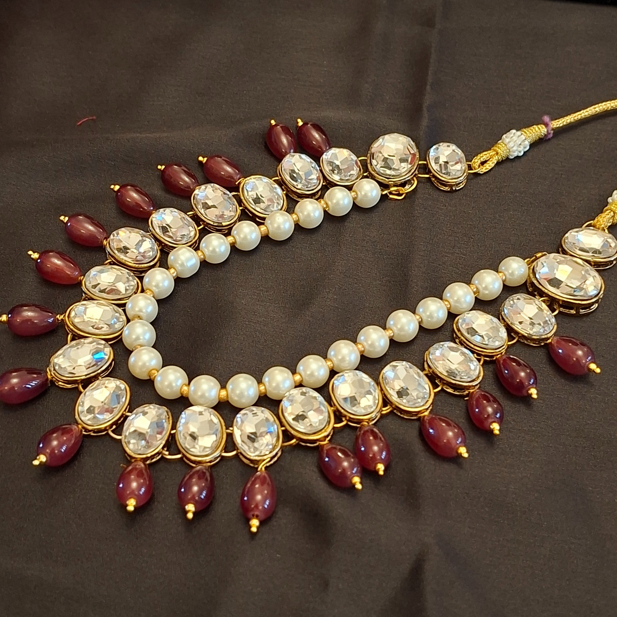 A traditional necklace has a layer of bold oval kundans with maroon glass bead hangings and a layer of 8mm pearls. This necklace is a must-have and can be worn for weddings; festive functions.
