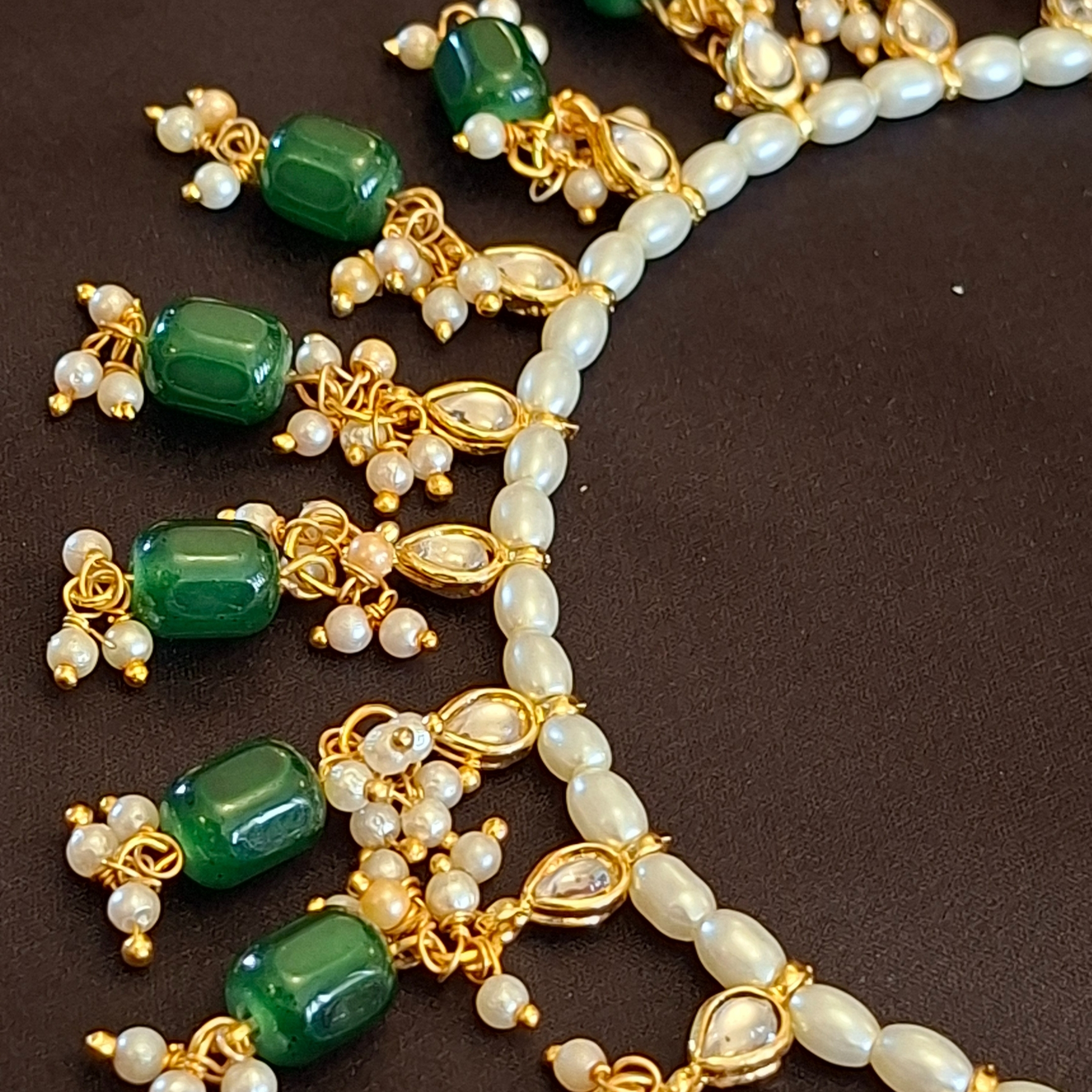 This is a full yet delicate necklace made pearls and long kundan green hangings. Will give a complete look to the dress you are wearing . A perfect piece to wear for weddings and festive occasions.