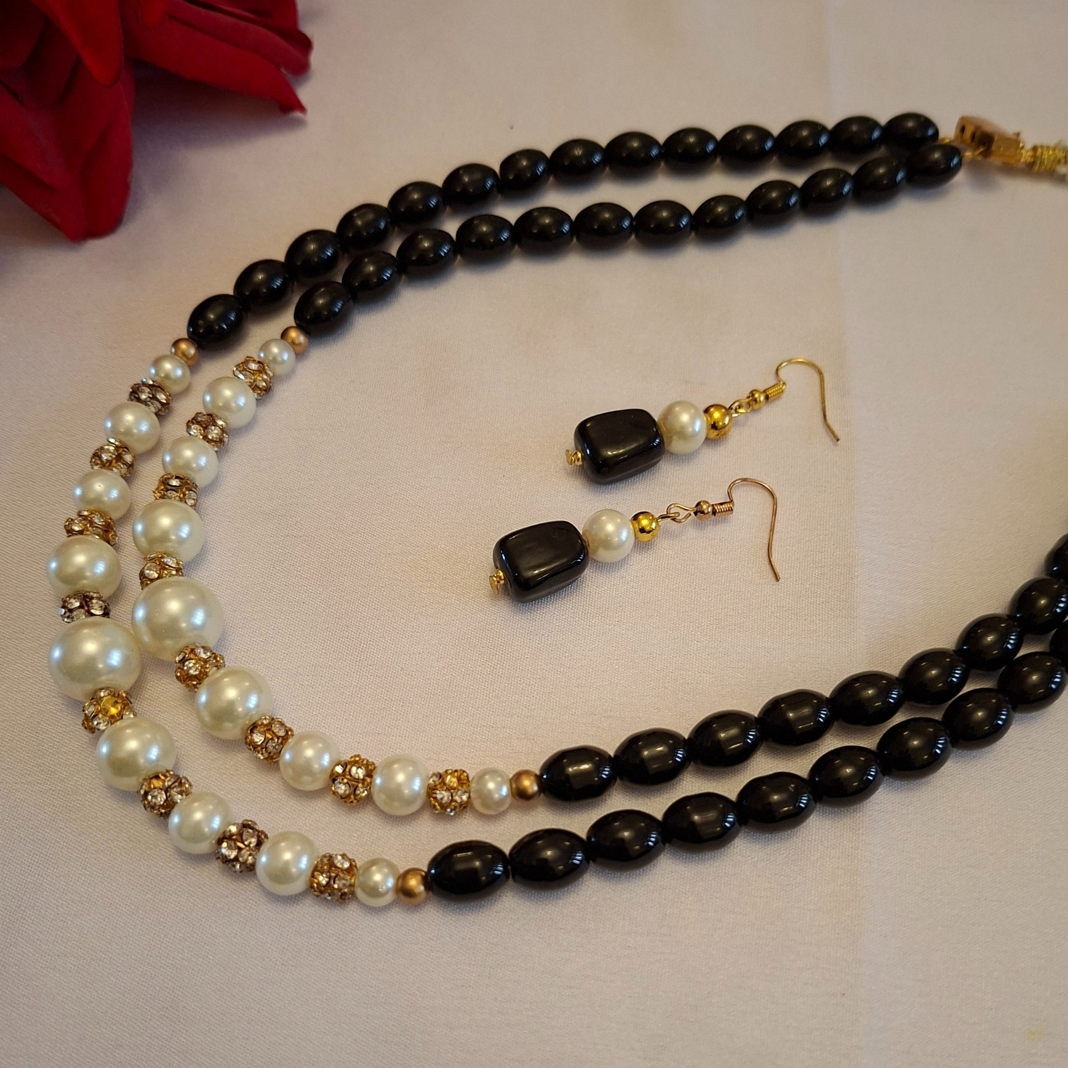 An evergreen double stranded necklace made with 8mm oval black coloured glass beads and pearls. The pearls in thr centre are arranged in a graded size. This can be worn for a formal and a semi formal occasion.